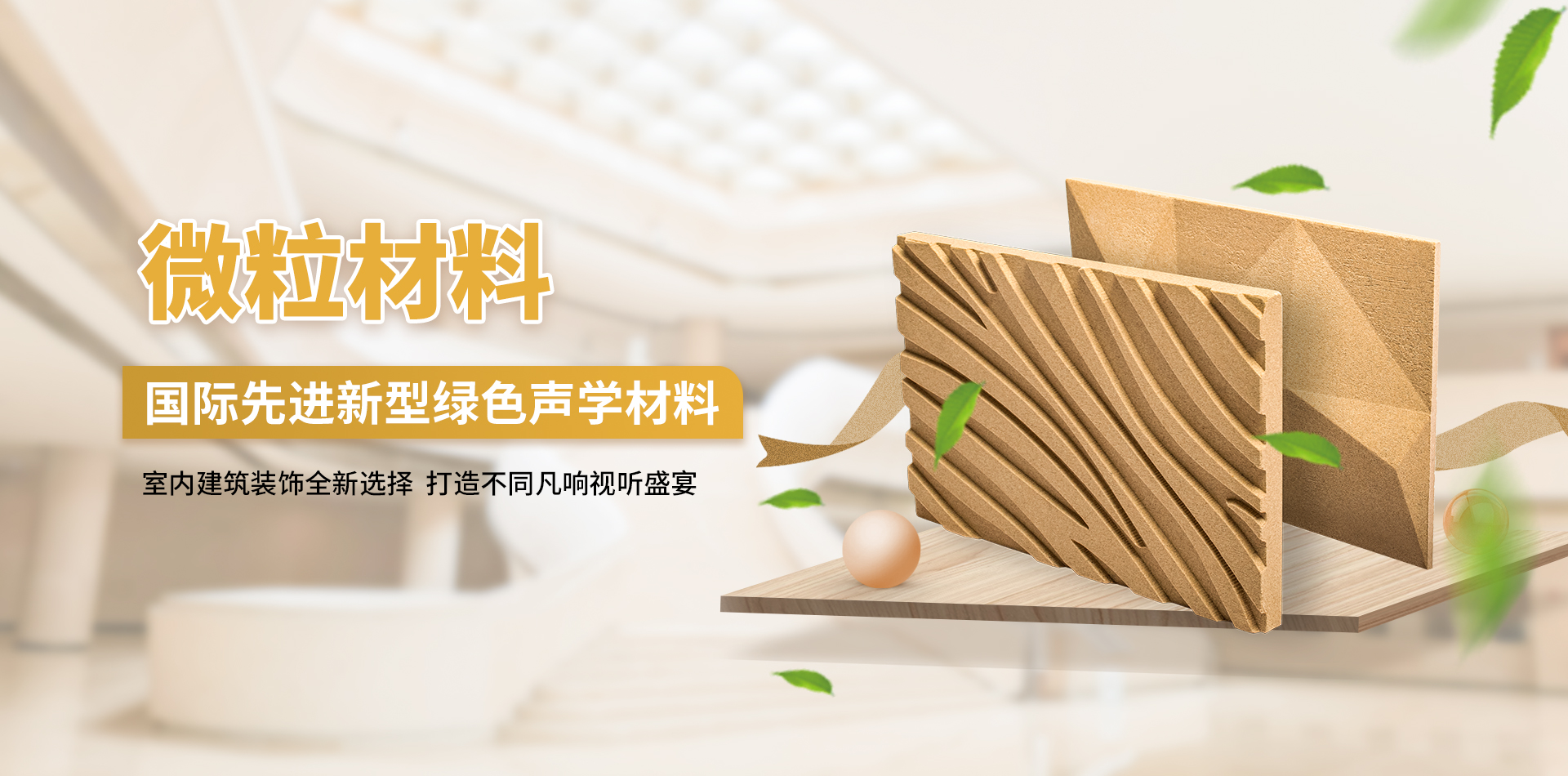 微粒材料是一種新型綠色裝飾材料,具備優異的聲學性和物理性能。該材料是以天然砂?;蚪洯h保處理的固廢顆粒為骨料,以環保膠凝劑,通過壓振工藝,生產的具有大量相互連通的微小空隙的多孔材料。